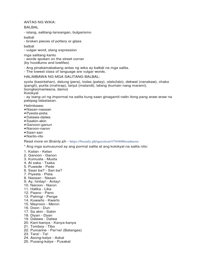 Pananaliksik Sa Gramatikang Filipino Kabanata 1 Wattpad G5 Kaibigan Antas Ng Wika Doc Antas Ng Wika Lilibeth Lapatha Academia Edu Embed 152351655 Mga Antas Ng Wika Antas Ng Wika Docx Ang Impluwensya Ng Kolokyal Na Mga Salita Na Gamit Ng Iba T Doc Pamatnubay Sa. Hanggang sa susunod na mga bagong balita mula dito lamang sa Philnews. Mga halimbawa ng balbal na salita.