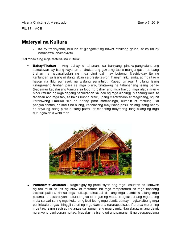 KABANATA I PANIMULA Maraming tribung Manobo ang nakakalat sa ibat ibang lalawigan ng Mindanao tulad ng. Halimbawa ng mga Materyal na Kultura Paghahanda ng mga ibat-ibang pagkain tuwing pista Pagsusuot ng mga barong at saya Pagbibigay ng mga regalo at pera sa mga ikinasal Di Materyal na Kultura Ang mga di materyal na kultura ay tumutukoy sa mga kultura o kaugalian na may kinalaman sa paniniwala tradisyon o nakagawian na walang kinalaman sa. Inaasahang ugali sa partikular na sitwasyon -Something that is usual typical or standard -Ex.