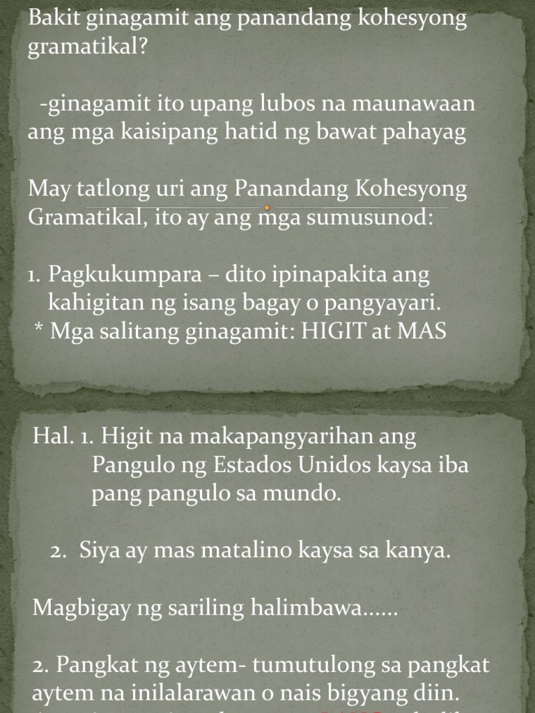 Ano ang kahulugan ng kohesyong gramatikal. Ang mga uri ng panandang kohesyon ay ang mga sumusunod. Anapora at Katapora Ang kohesyong gramatikal o Cohesive Device Reference ay nahahati sa dalawa na nagpapatungkol sa ibat ibang bagay. Want this question answered.
